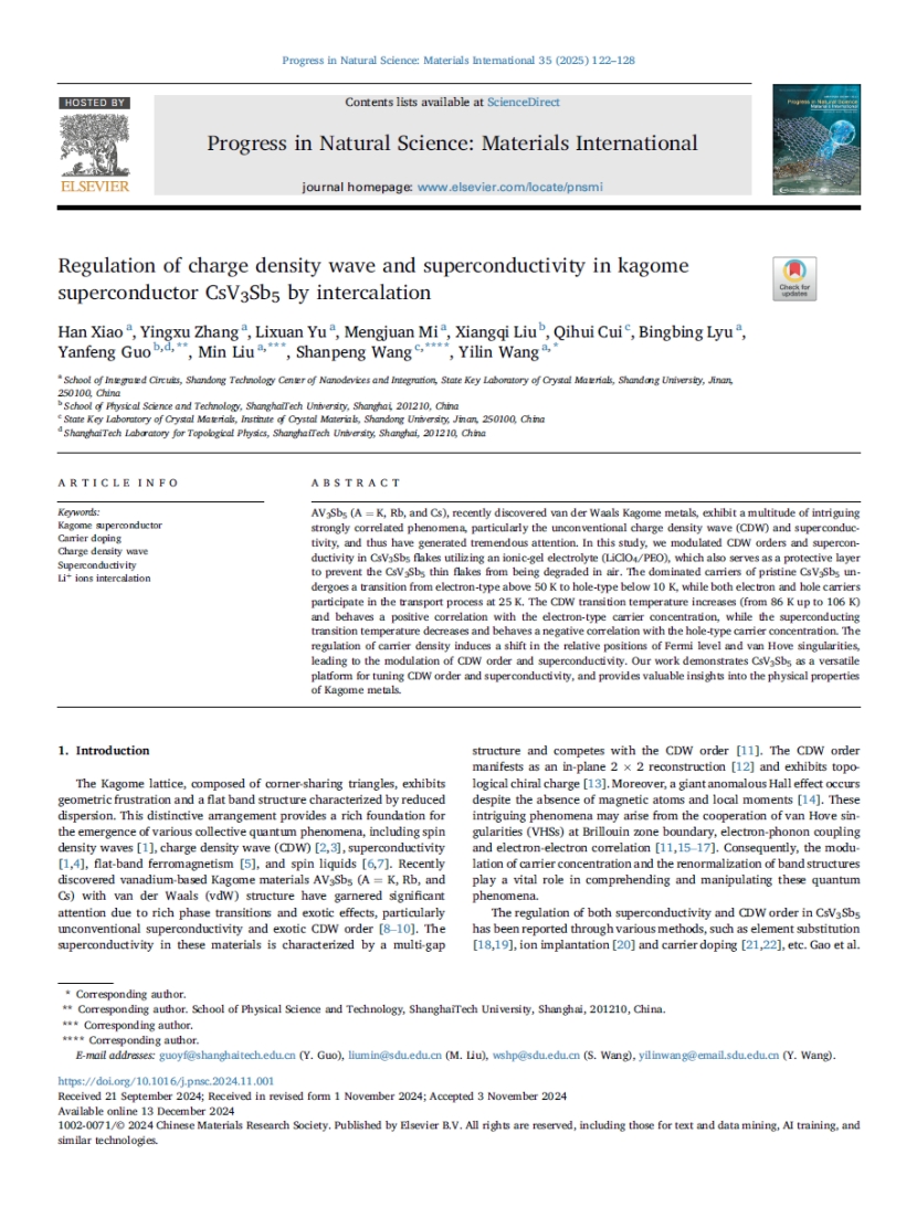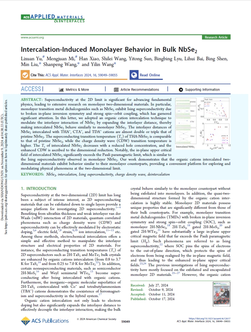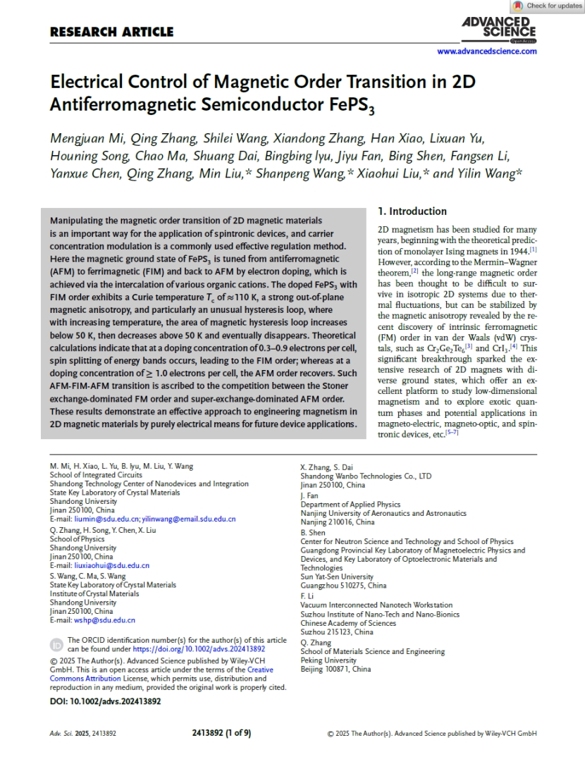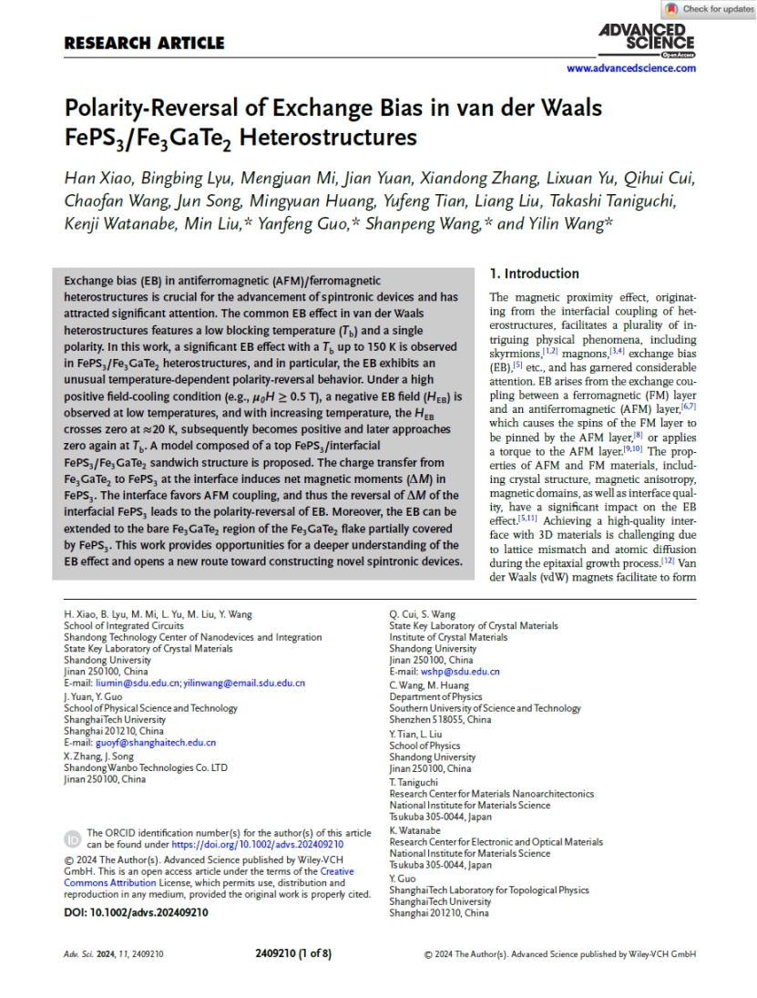 依托该设备在低温强磁场电学输运测试、磁性测试方面的技术优势,研究团队系统开展了新型磁性半导体材料的基础科研工作,获批国家自然科学基金面上项目1项,获得山东省泰山学者青年专家1人,在《Advanced Science》等高水平SCI期刊发表论文4篇。